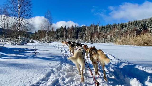 Ajunsi in zona statiunii Harghita Bai, traim una dintre cele mai frumoase experiente de iarna: plimbarea cu sania trasa de caini Husky. Inspirata din traditiile nordice, aceasta aventura ne poarta pe un traseu de aproximativ 2 km (dificultate usoara, 15 minute), cu 8 - 10 caini in ham, alaturi de musher.